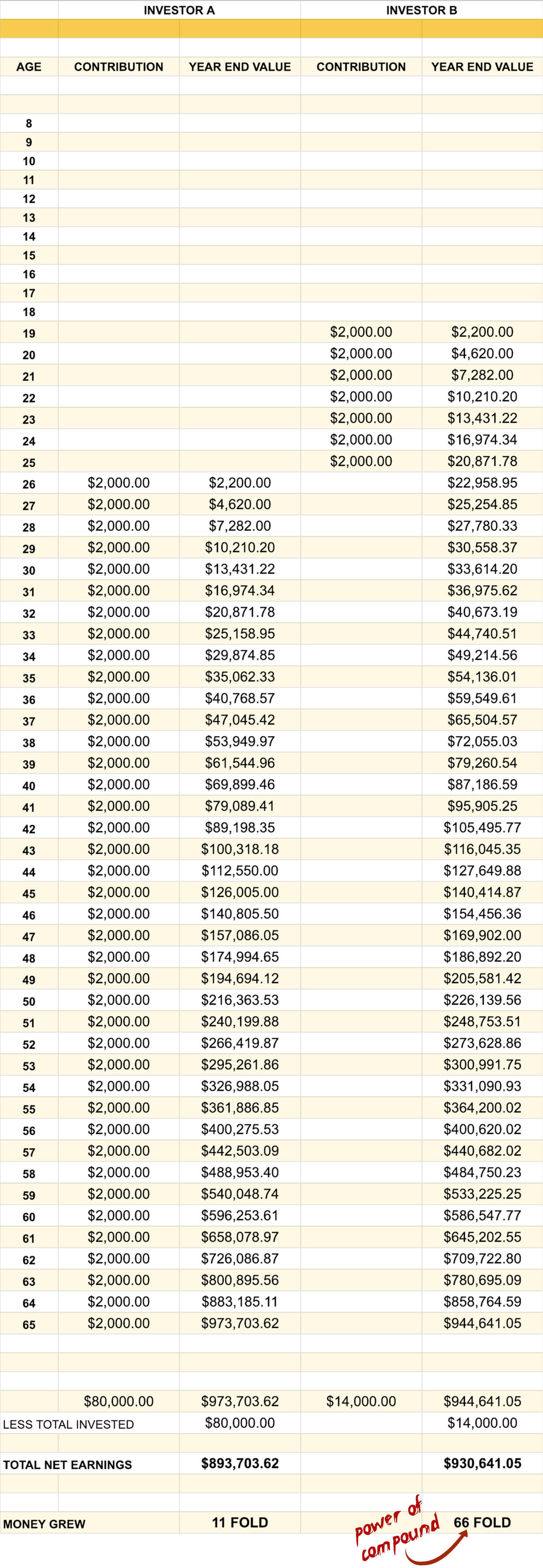 INVESTOR B- 19 yrs old and invests $2,000 per year for just 7 years until 26yrs old. Whilst INVESTOR A- Delays investing by just 7 years and then at 26yrs old, starts investing the same $2,000 per year... BUT FOR THE NEXT 40 YEARS!